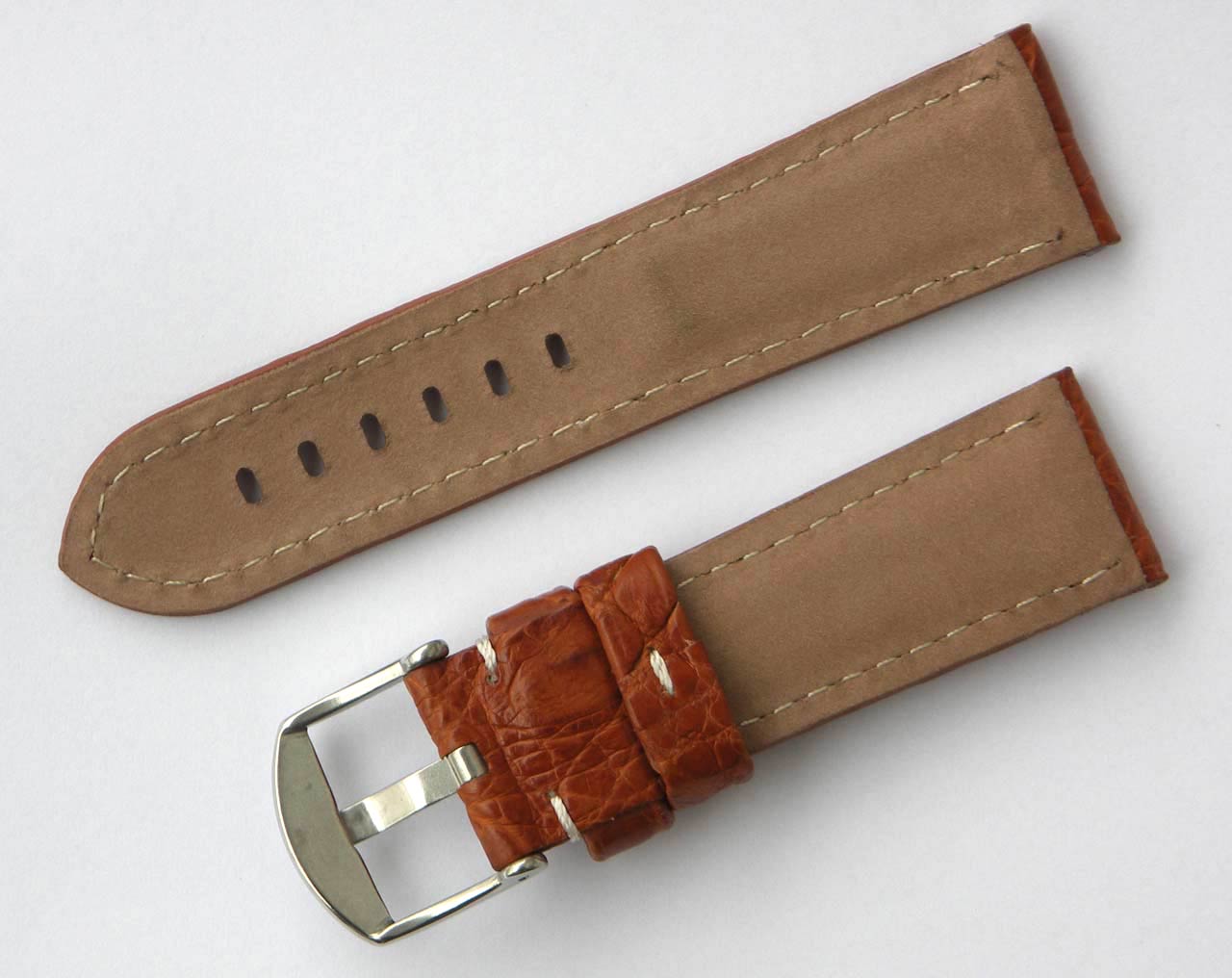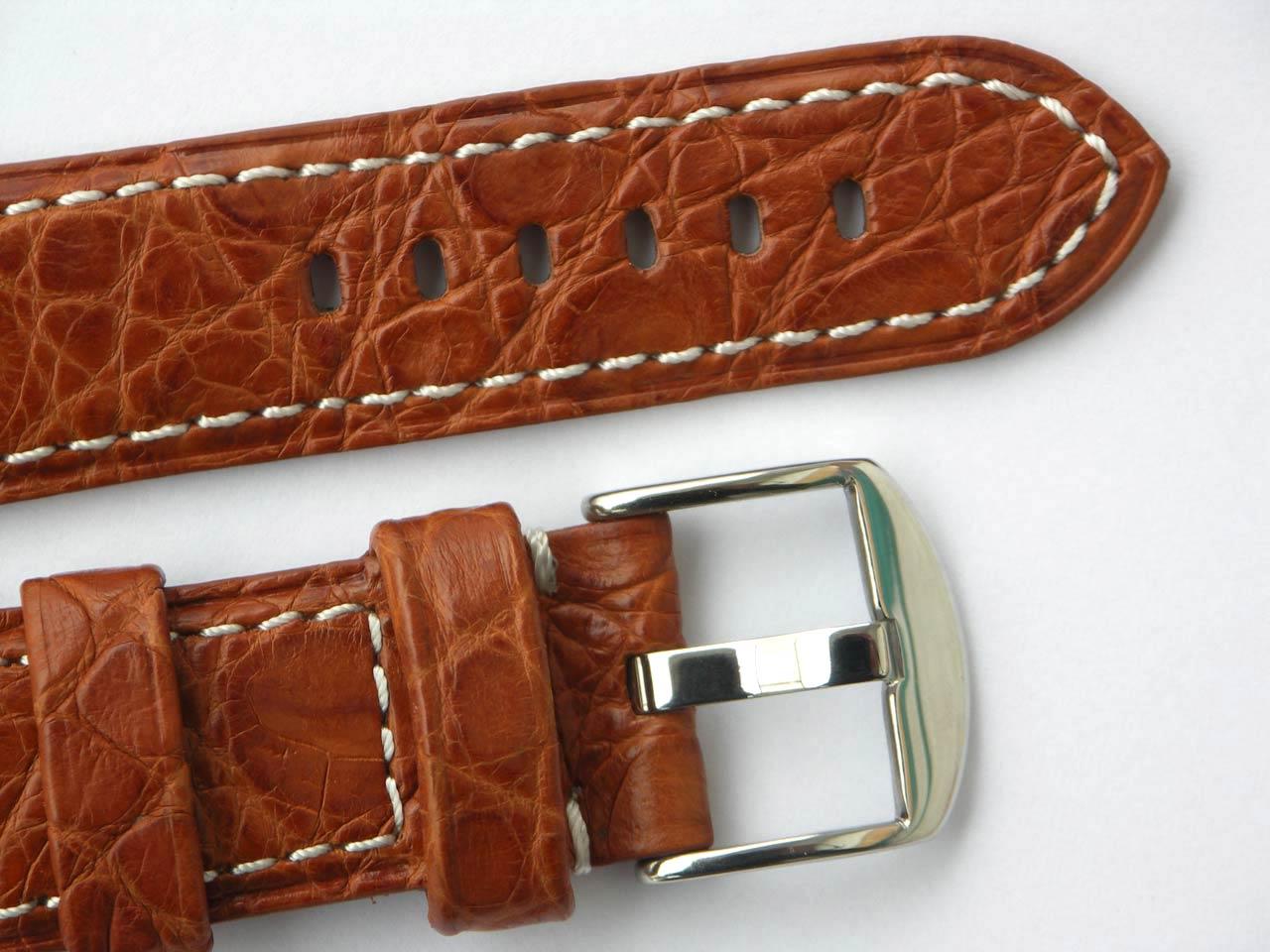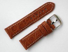 Pasek typ Panerai -A1- naturalna skóra z krokodyla. Bardzo wysoka jakość wykonania. Usztywnienia w części wpięcia do zegarka, pozostała część bardzo miękka. Gwarantuje to wieloletni okres użytkowania. Wymiary: szerokość 24 mm przy zegarku i 22 mm przy klamerce, długość: 76 mm oraz 115 mm. Paski bez loga